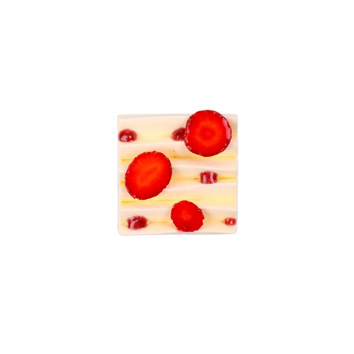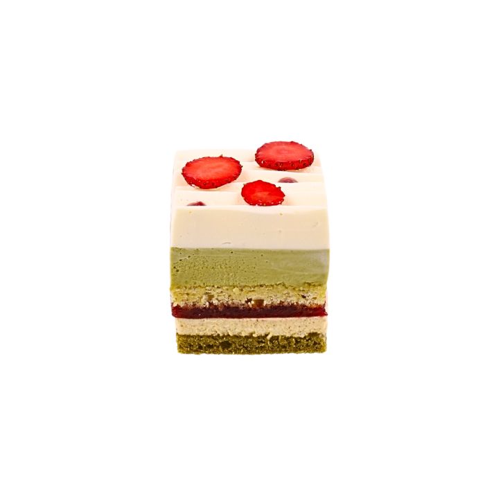 Playful and vibrant, this triple-layer delight swirls with the colors of matcha, strawberry, and vanilla. Soft and tender like a câlin (a hug), it dances across the palate with rhythm and cheer. One bite and the mood turns instantly joyeux.